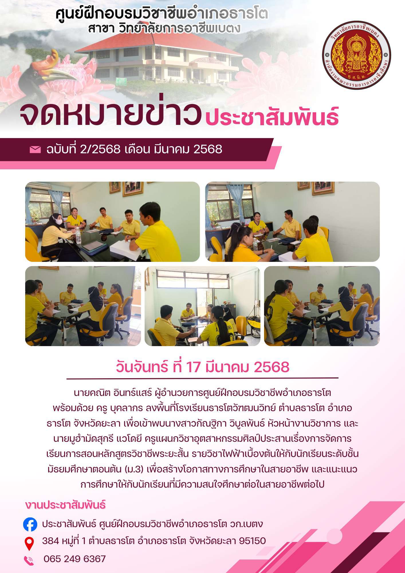 นายคณิต อินทร์แสร์ ผู้อำนวยการศูนย์ฝึกอบรมวิชาชีพอำเภอธารโต พร้อมด้วย ครู บุคลากร ลงพื้นที่โรงเรียนธารโตวัฑฒนวิทย์ ตำบลธารโต อำเภอธารโต จังหวัดยะลา เพื่อเข้าพบนางสาวกัณฐิกา วิบูลพันธ์ หัวหน้างานวิชาการ และนายมูฮำมัดสุกรี แวโดยี ครูแผนกวิชาอุตสาหกรรมศิลป์ประสานเรื่องการจัดการเรียนการสอนหลักสูตรวิชาชีพระยะสั้น รายวิชาไฟฟ้าเบื้องต้นให้กับนักเรียนระดับชั้นมัธยมศึกษาตอนต้น (ม.3) เพื่อสร้างโอกาสทางการศึกษาในสายอาชีพ และแนะแนวการศึกษาให้กับนักเรียนที่มีความสนใจศึกษาต่อในสายอาชีพต่อไป